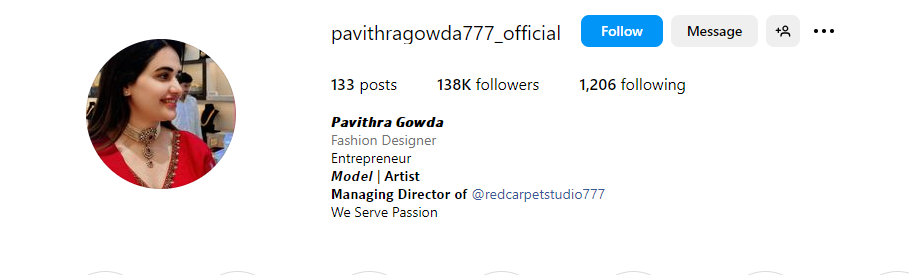 Pavitra Gowda has 138000 followers on Instagram and he has also followed 1206 people. It is seen here that till now he has posted 133 votes on his Instagram and the ID of his Instagram is created in the name of pavithragowda777_official.